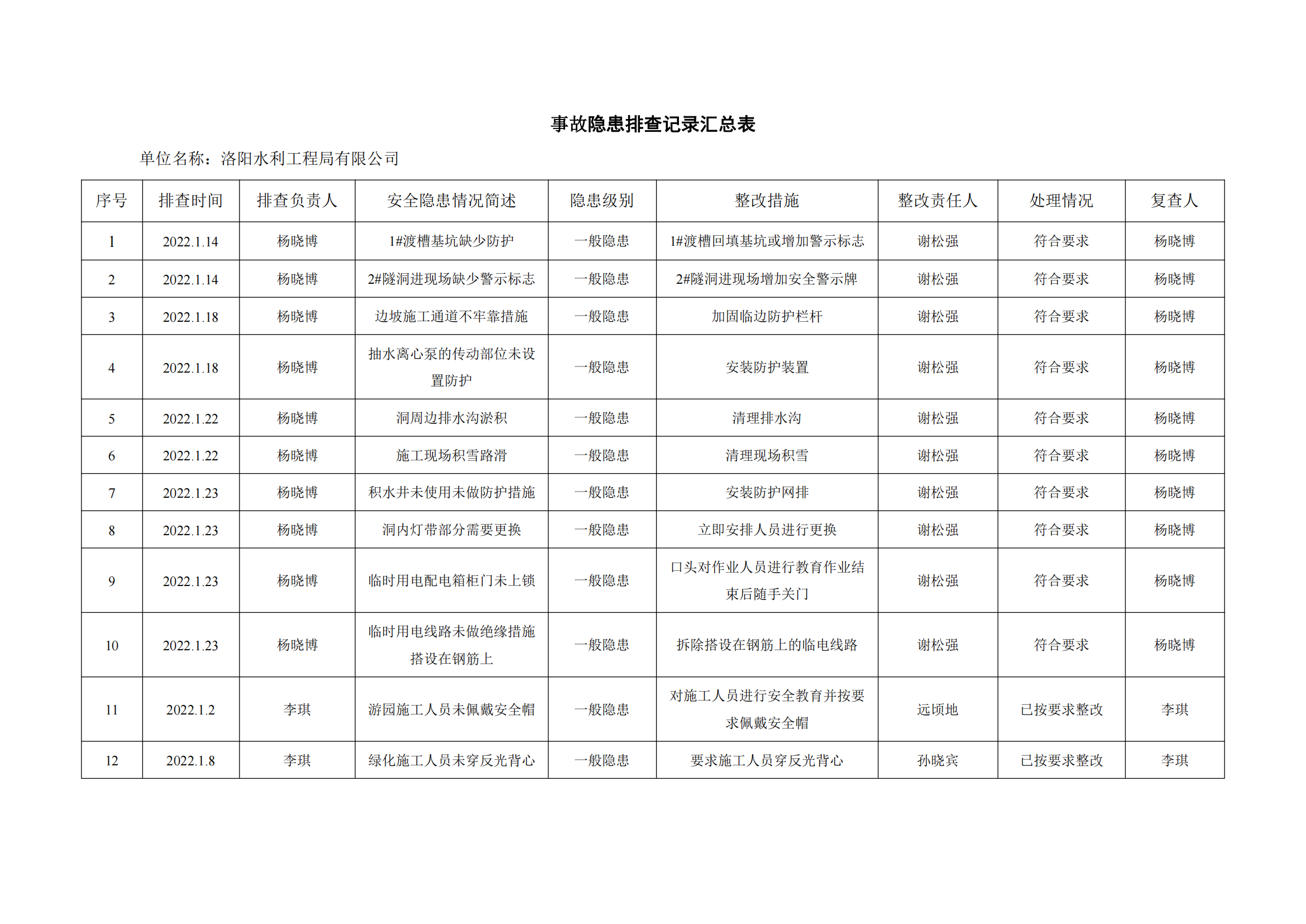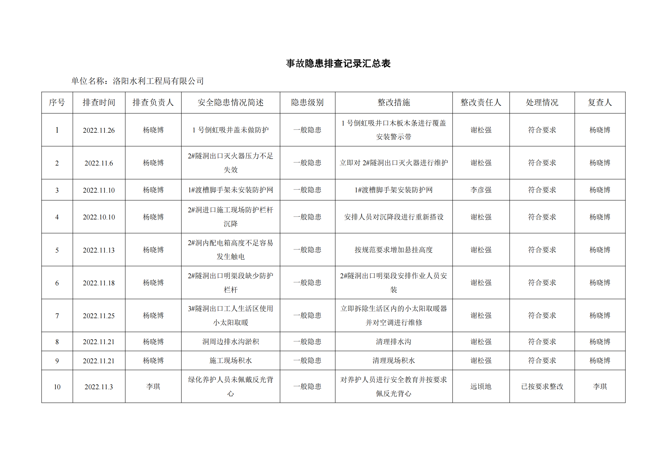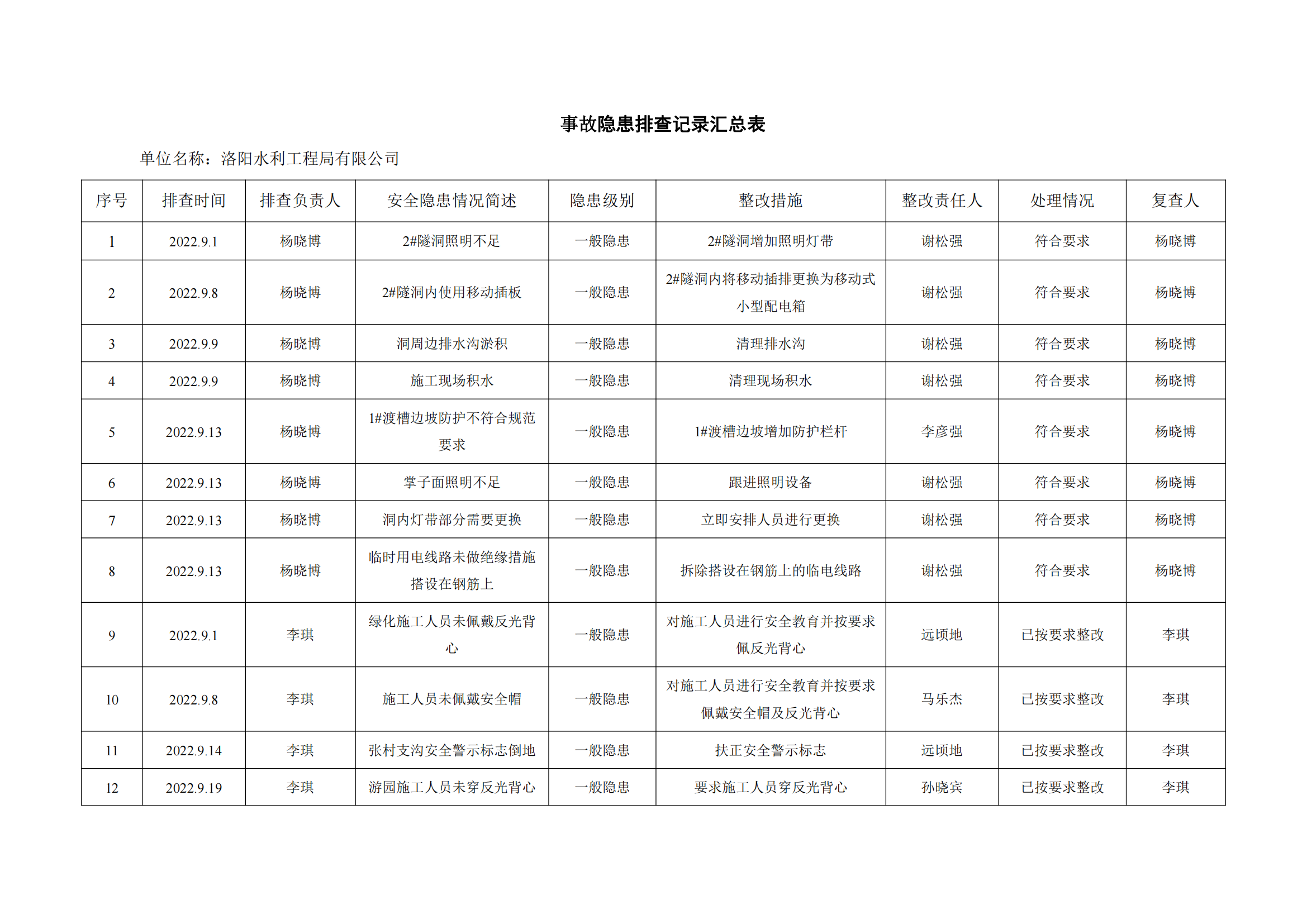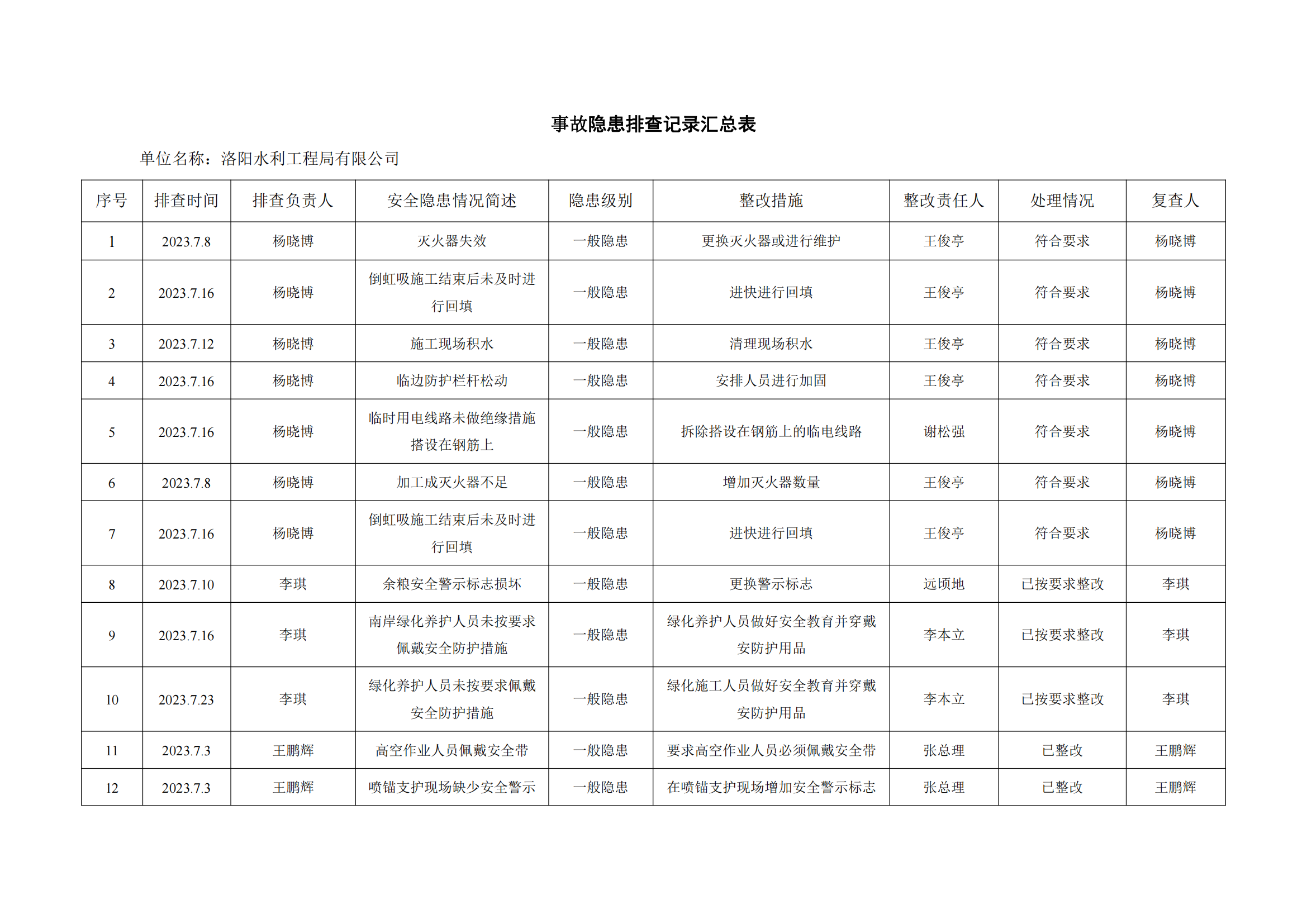 公司匯總事故隱患排查記錄匯總表