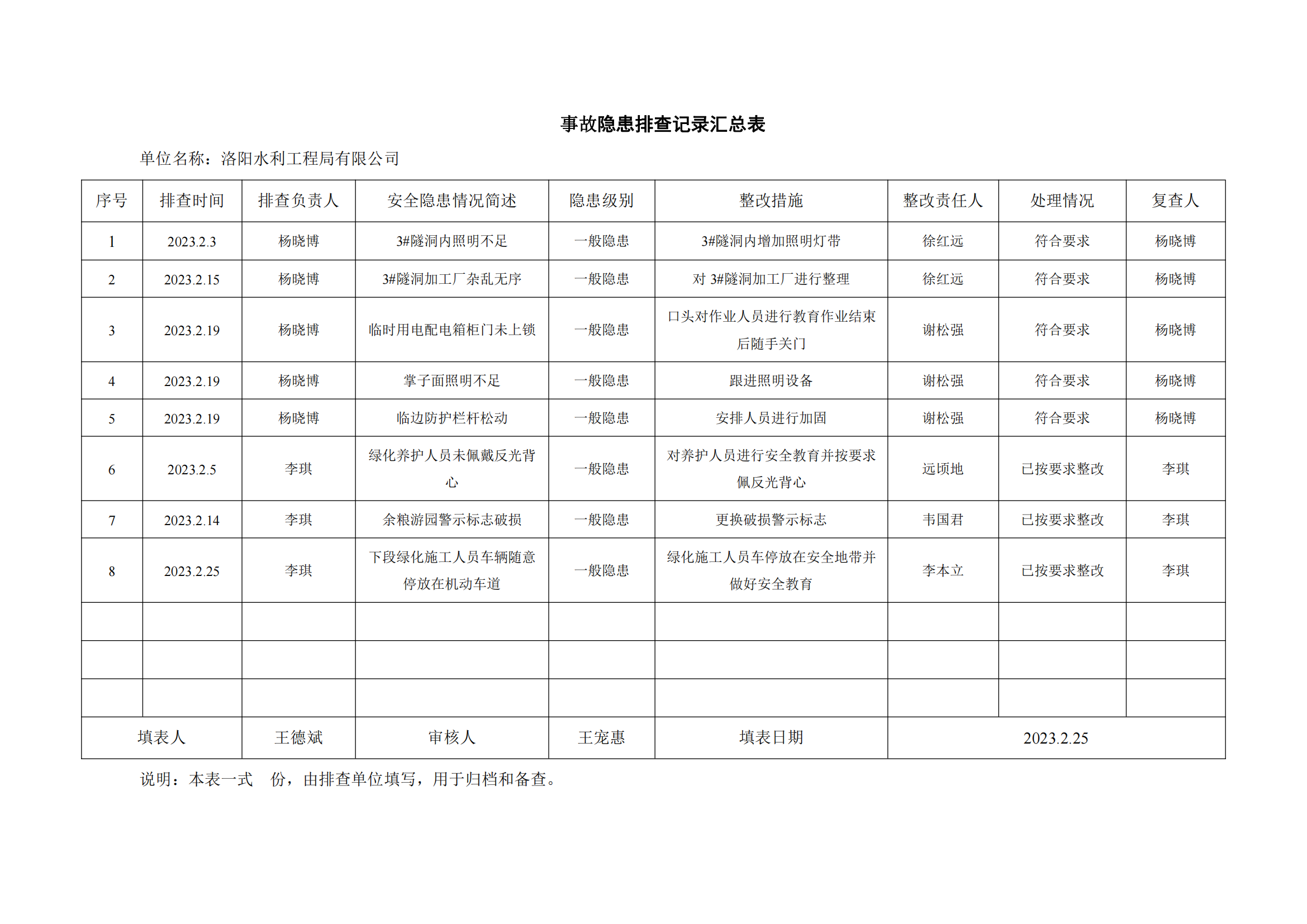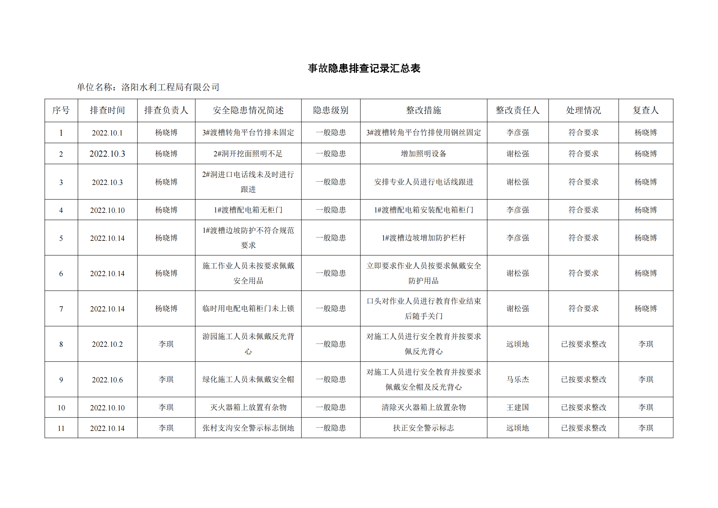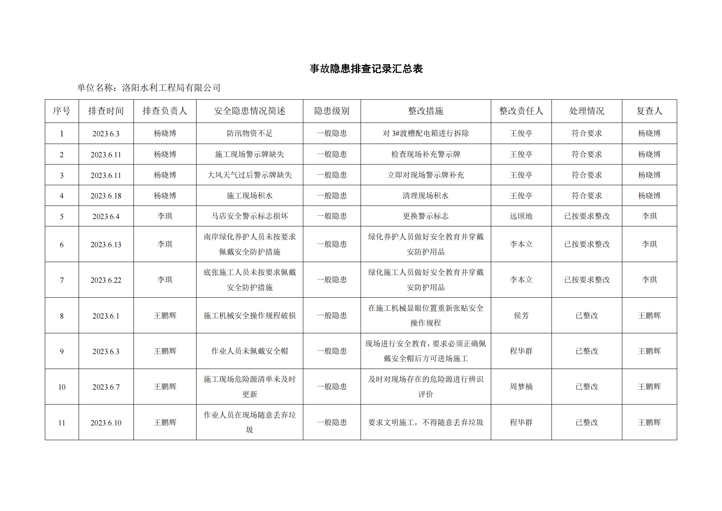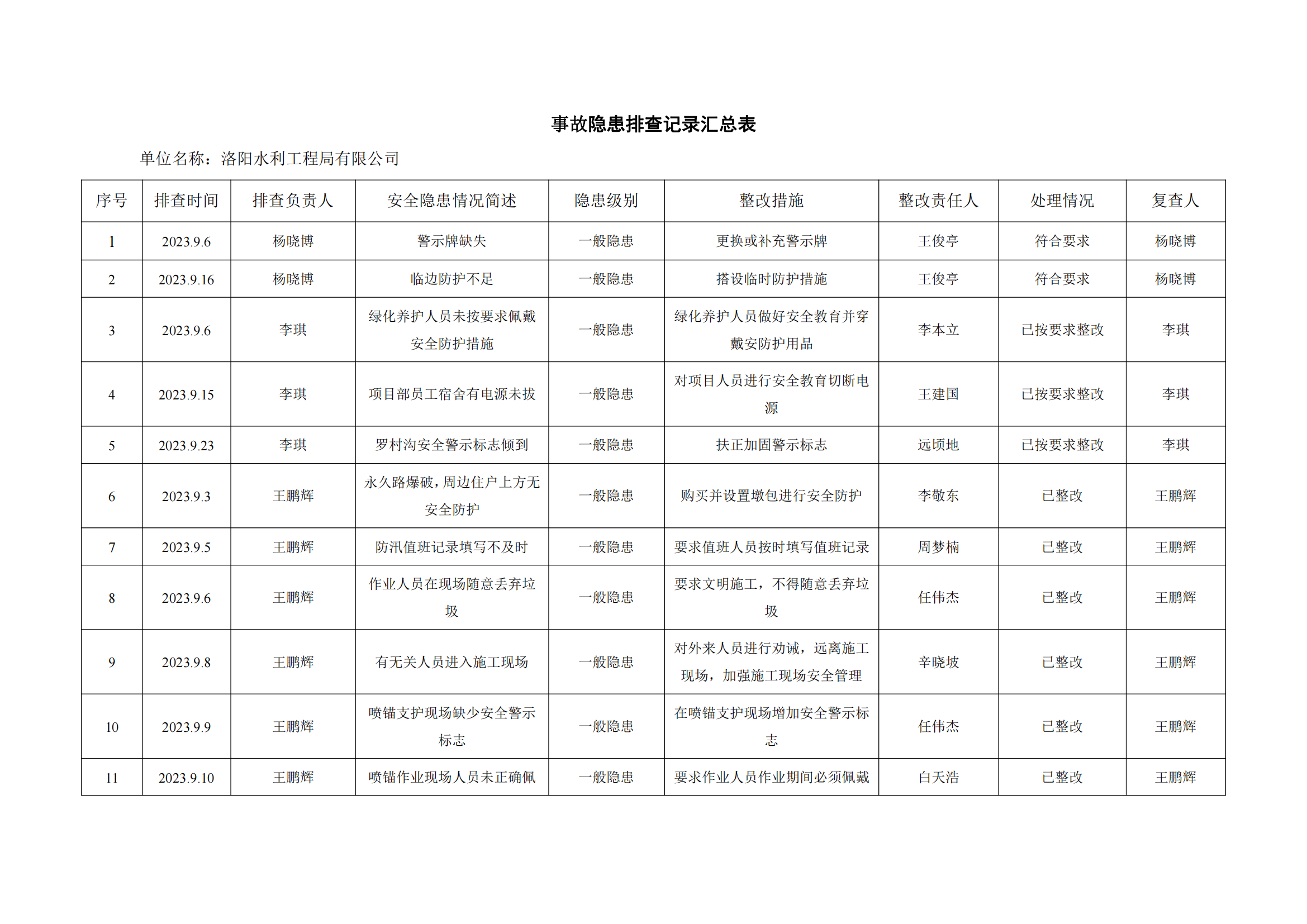 公司匯總事故隱患排查記錄匯總表