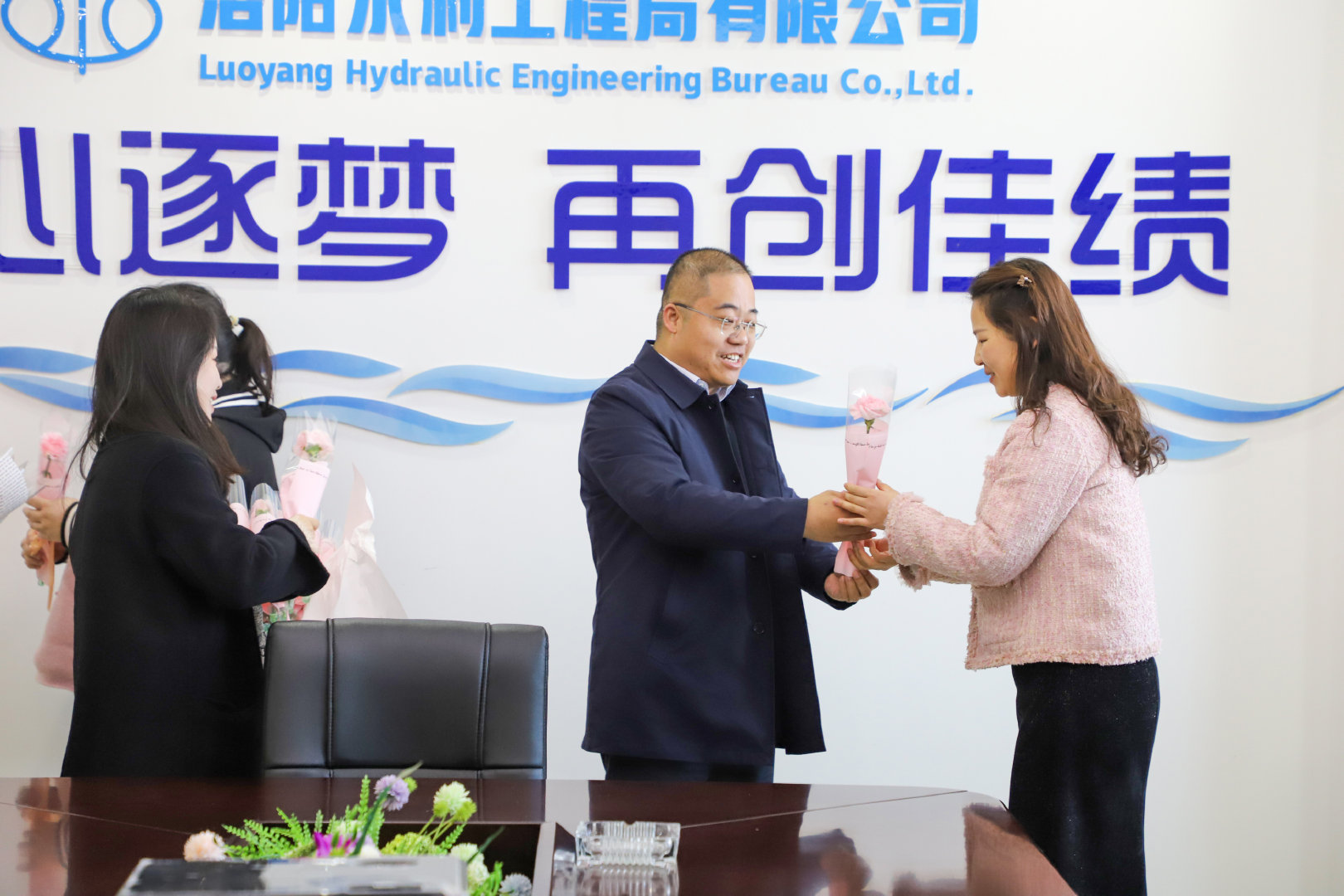 陽春三月春意濃,人面桃花相映紅,第114個“三八”婦女節(jié)如期而至,為充分調(diào)動女職工工作積極性、主動性和創(chuàng)造性,增強(qiáng)女職工的向心力和凝聚力,3月8日上午,集團(tuán)公司李東坤等領(lǐng)導(dǎo)到中共洛陽水利工程局有限公司委員會(以下簡稱“公司黨委”)為女職工送上鮮花和節(jié)日美好祝福。